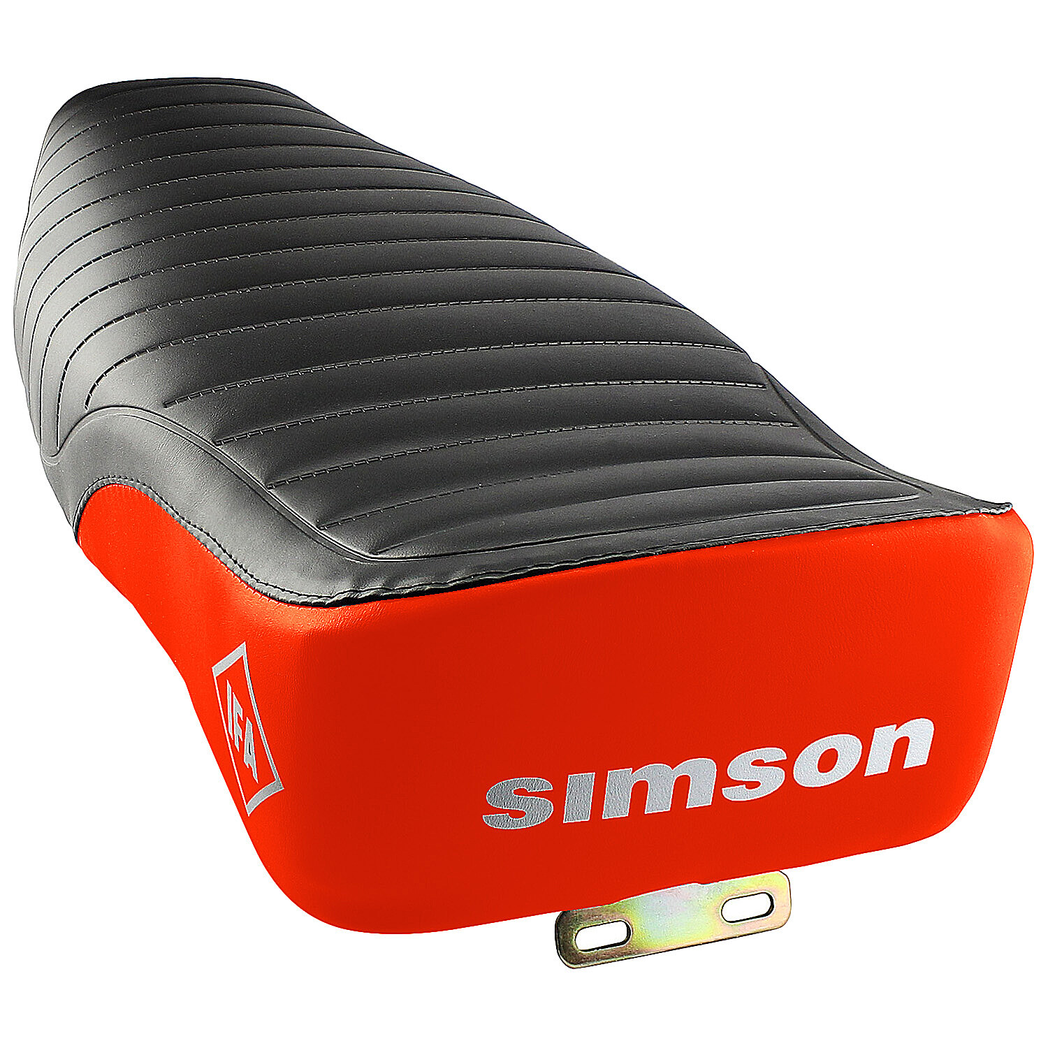 Complete seat for Simson motorcycles in black and red with IFA logo on the sides and Simson inscription on the back. The seat cover is provided with anti-slip ribbing in the upper part, the seat sheet is surface-treated with galvanic zinc. Although the Elektronik variant originally had a smooth surface, this seat can also be used on this model.