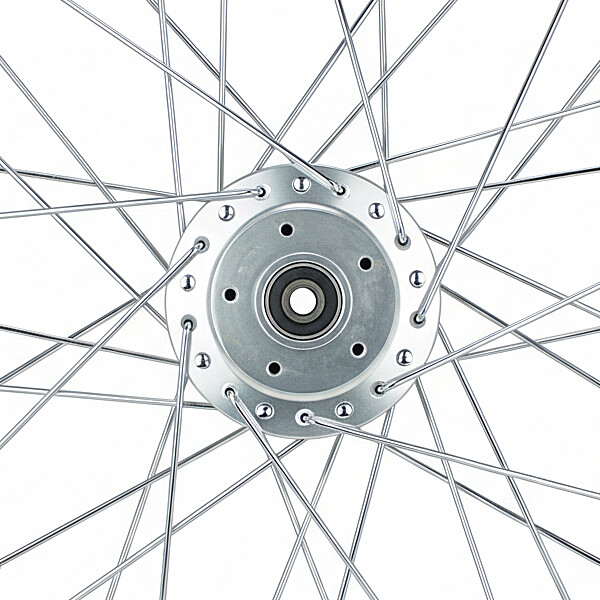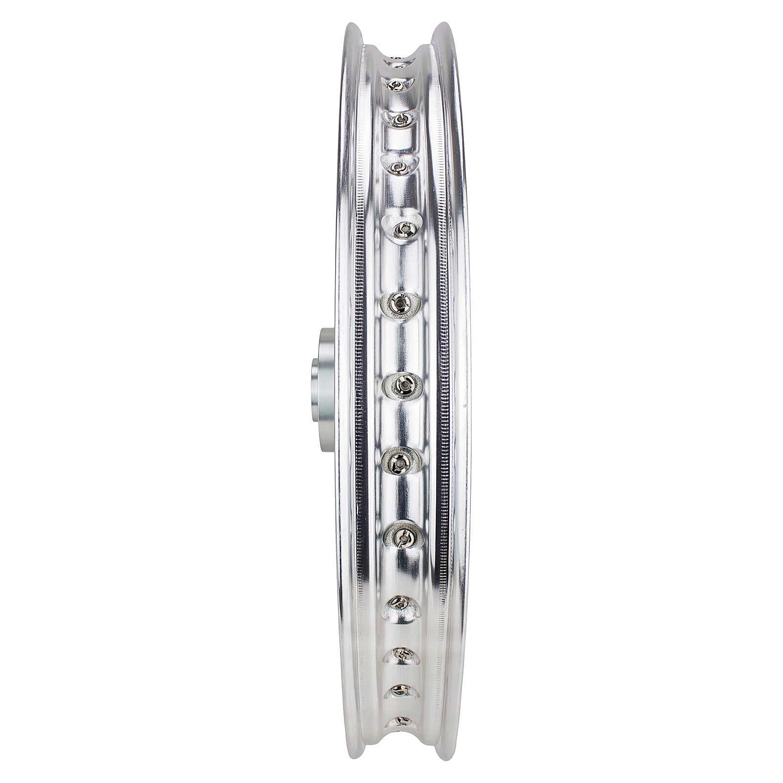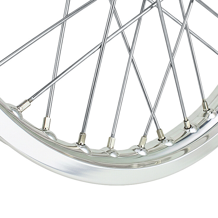 Complete front wheel with aluminum rim and chrome spokes designed for disc brake systems on Simson motorcycles. The wheel is compatible with the disc brake set ( SIM24528135 ) when mounted in the original front telescopic forks or in the front fork set with modern damping ( SIM65980243 ).