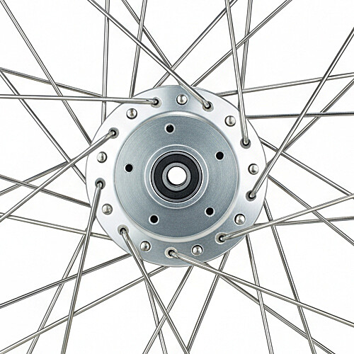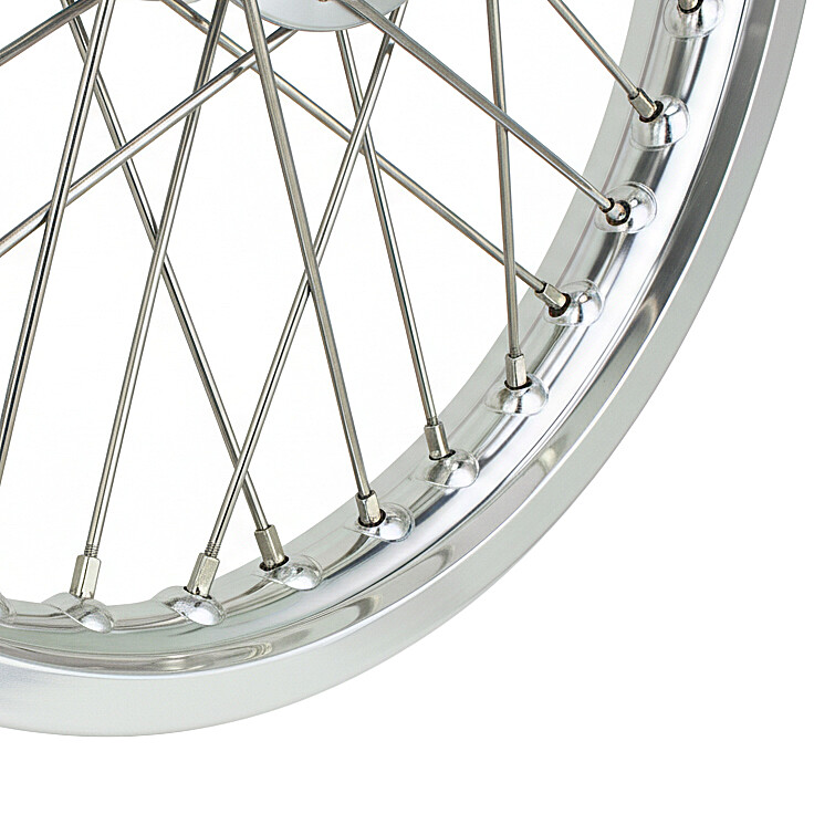 Complete front wheel with aluminum rim and stainless steel spokes designed for disc brake systems on Simson motorcycles. The wheel is compatible with the disc brake set ( SIM24528135 ) when mounted in the original front telescopic forks or in the front fork set with modern damping ( SIM65980243 ).