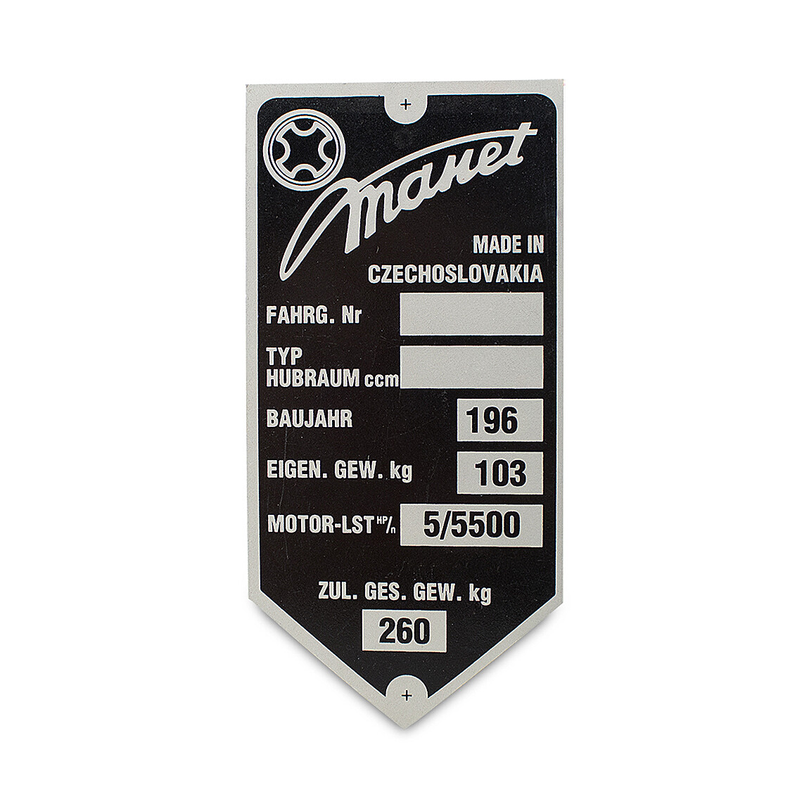Printed aluminum frame label for Manet Tatran motorcycles
