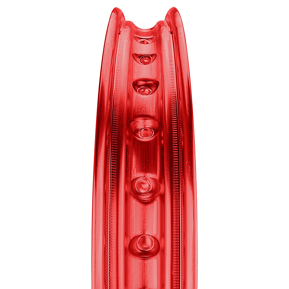 Aluminum rim measuring 16 x 1.6 from DPR with a distinctive surface finish. Red anodizing gives the rim an attractive appearance and provides basic material protection.